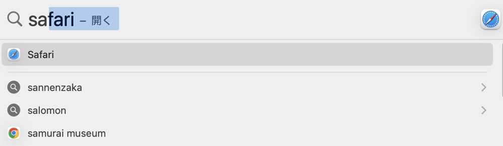 例えばSafariを起動する場合、Dockから探す必要はありません。Spotlightを開いて「sa」と入力するだけで候補が表示されます。Enterキーを押せば即起動します。