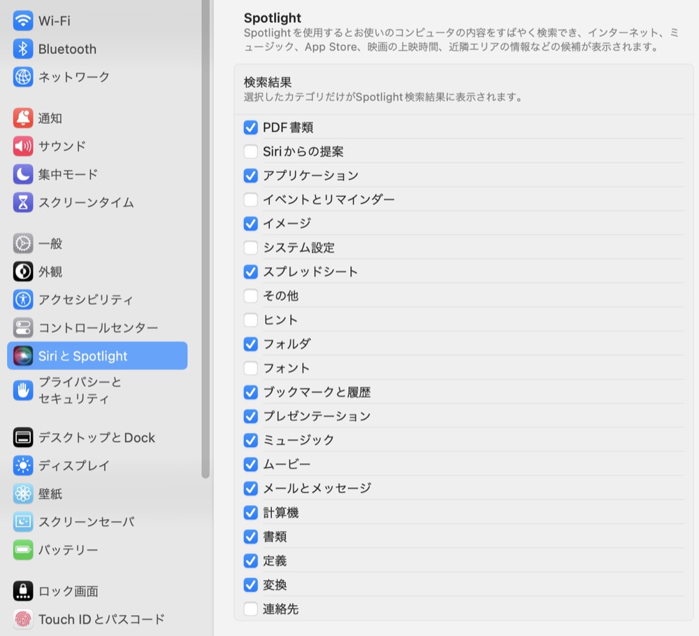 「システム設定」→「SiriとSpotlight」→「検索結果」から、検索対象を調整できます。